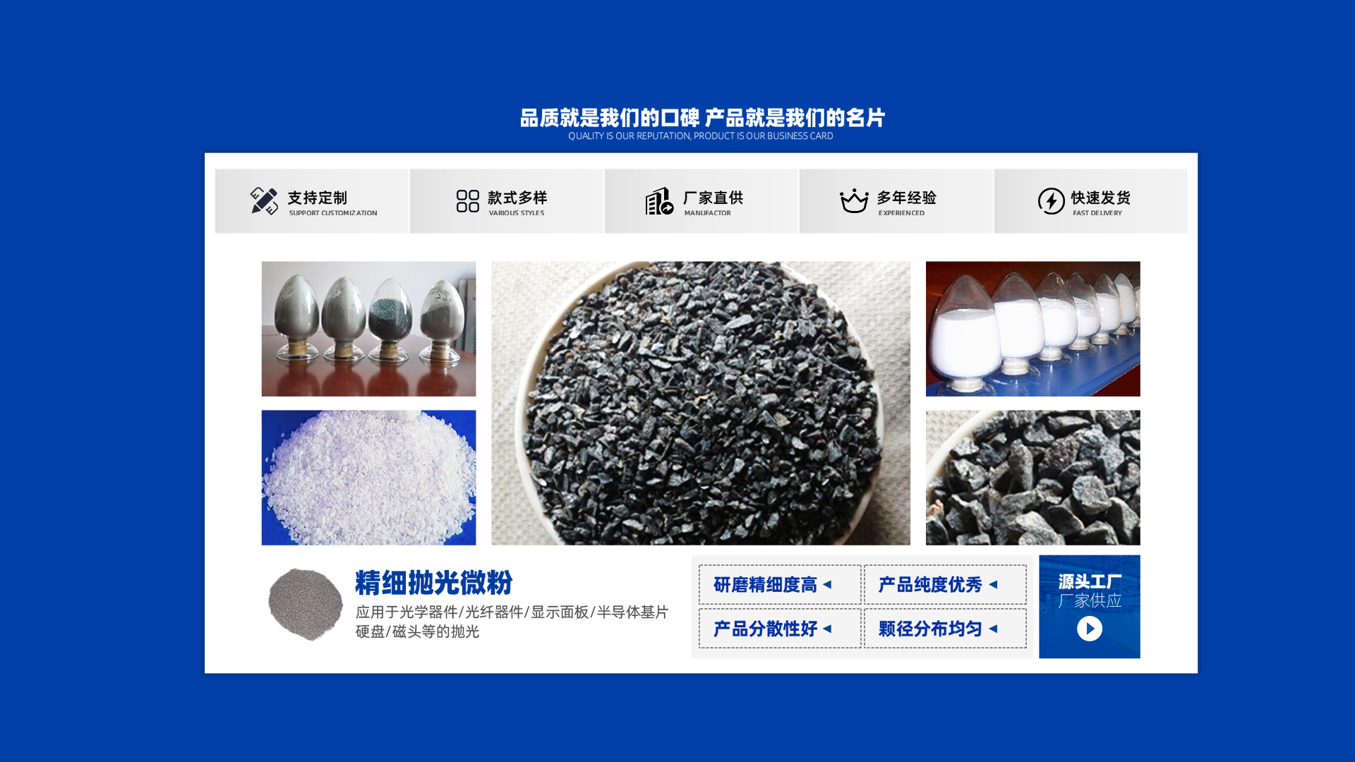公司另外提供陶瓷砂輪專用砂,粒度有8#、10#、12#、14#、16#、20#、 24#、30#、36#至325#各種目數(shù)均可提供。是砂輪廠、耐火材料廠、噴砂、除銹廠的產品。